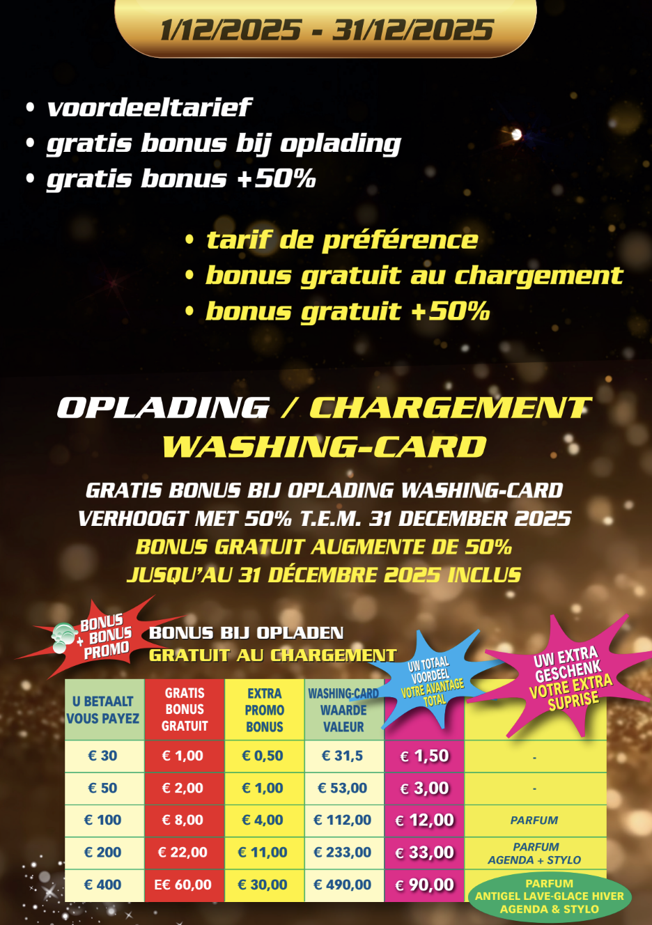 Deze maand hebben we heel wat voor jou in petto! Zo geniet je bij de oplading van je Washing Card van een gratis bonus en verhogen we deze met 50% t.e.m. 31 december.